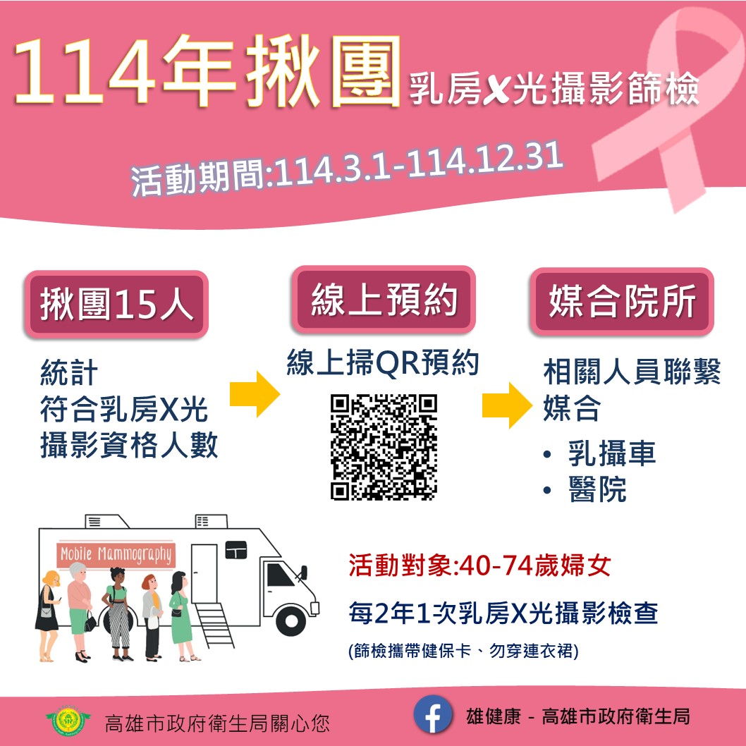 (三)活動方式:揪團符合篩檢資格者15(含)人以上,即安排媒合乳攝車或醫院綠色通道篩檢。